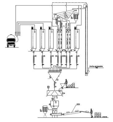 Зразкова специфікація обладнання з виробництва сухихбудівельних сумішів (СБС). - Станція підготовки піску.- Сушарка для піску.- Пилозбірна система.- Накопичувальні сило для базових сировинних матеріалів та добавок.- Вентиляційна система з філтрами та вентиляторами.- Система дозування сировинних матеріалів та добавок.- Зважувач сировинних компонентів.- Порційний змішувач.- Система транспортування та зберігання готової продукції.- Лінія пакування продукції.- Пилозбірна система пакувальної машини.- Компресорна станція.- Електрична система та електронна система управління.- Інша комплектація (залежно від розміру установки та поба- жань Замовника). Приклади подібної сировини:- гіпс (Бета-напівгідрат),- вапняне борошно (0 - 0,09 мм),- вапняковий пісок (0,09 – 0,6 мм),- вапняковий пісок: (0,6 – 1,2 мм),- інші додаткові компоненти: засіб для вологості,- згущувач, сповільнювач та інші речовини, залежно від рецептури продукту. Базові рецептури окремих продуктів розробляються спів-робітниками постачальника устаткування разом із Замовни-ком.Після проходження курсу інструктажу та спільного створеннябазових рецептур співробітники замовника здатні самостійностворювати схожі продукти та їх модифікації. Спрощена схема технологічного процесу: