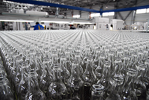 Варіння скломаси.Для варіння скломаси використовується ванна (скловарна піч)безперервної дії. У печі, як паливо, використовується природ-ний газ. Завантаження скловарної печі шихтою та склобоємздійснюється повністю автоматично, відповідно до передба-ченого режиму. Піч скловаріння складається з наступних складових частин:- варильний басейн,- протока,- виробничий басейн,- пальники,- регенератори,- інша комплектація. Варіння скломаси у ванні (печі) відбувається при температу-рах: від 1.200°C до 1.550°C.За допомогою різних добавок скломасу освітлюють та звільня-ють від газових включень. Шляхом ретельно перемішуваннямаси досягається однорідність складу скла та певна в'язкість. Формування склотари.Готова скломаса подається до формувальних автоматів, дездійснюється формування виробів із застосуванням відповід-ного оснащення.Типова ємність склотари: 0,25 - 0,5 - 0,75 - 1,0 л.Можливі практично будь-які форми та ємності склотари.